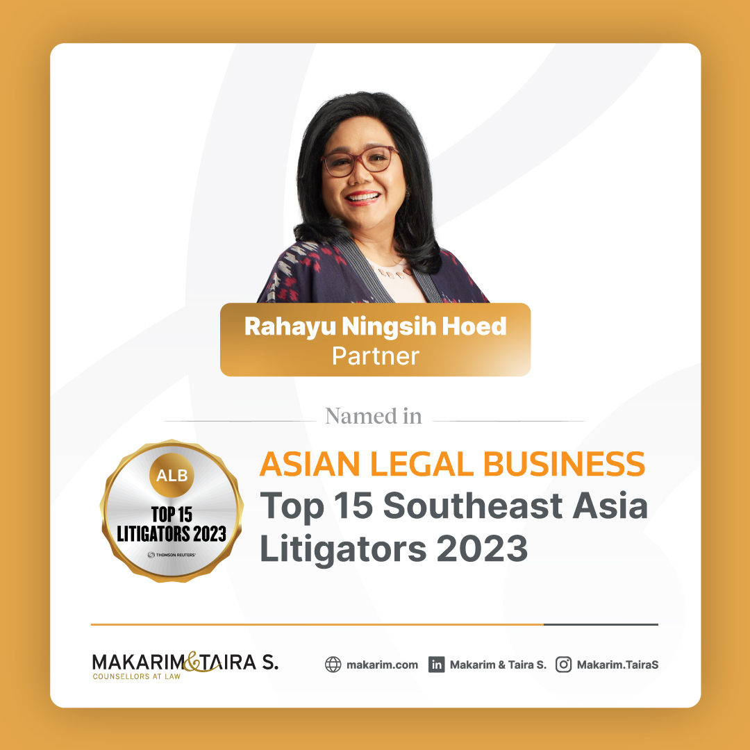 We are pleased to share that our Senior Partner, Rahayu Ningsih Hoed, has been recognized in ALB Southeast Asia’s Top 15 Litigators 2023. In its inaugural list, Asian Legal Business honors the leading litigators in the highest-impact disputes across Southeast Asia region.