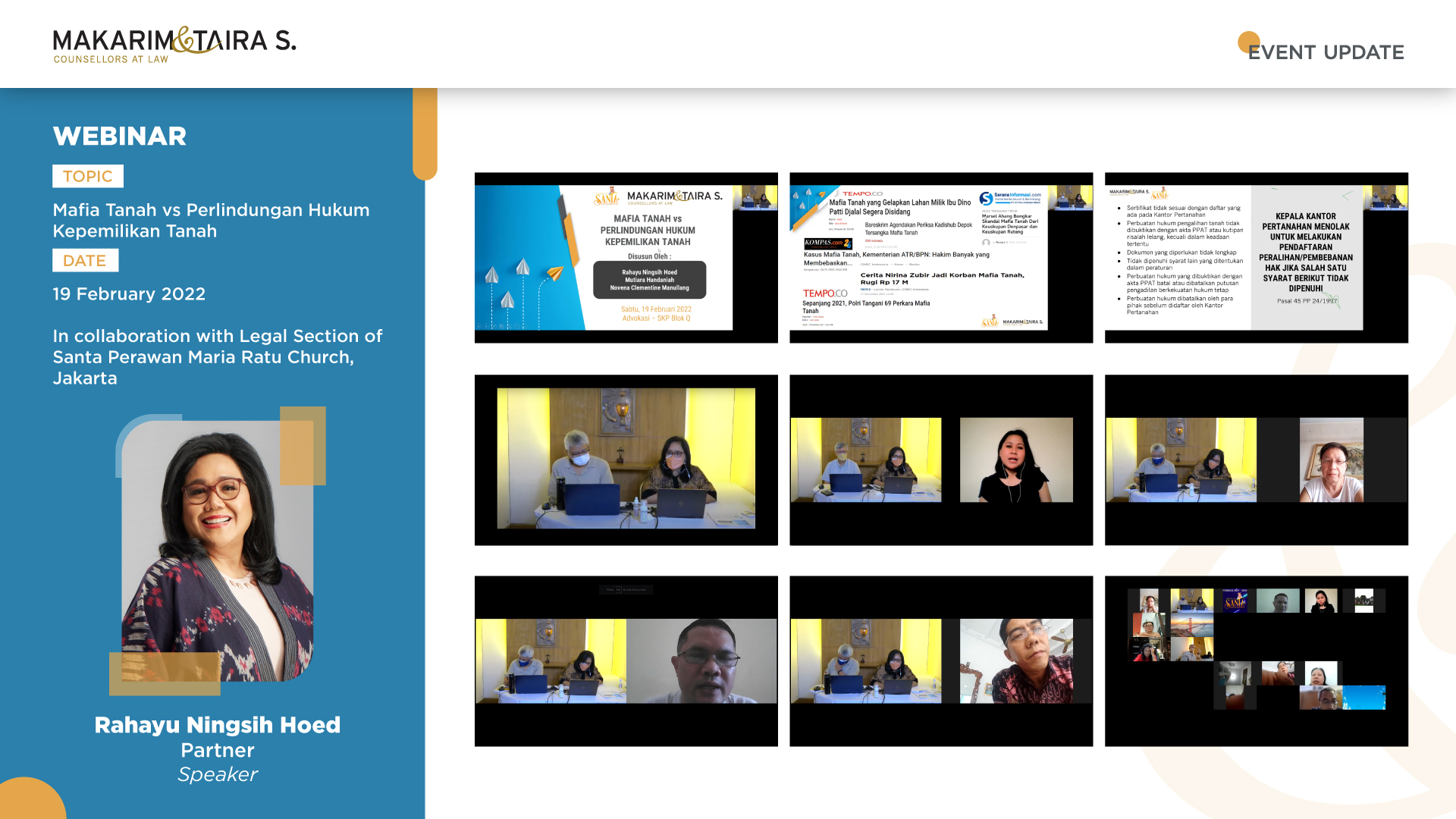 On Saturday, 19 February 2022, our Partner, Rahayu Ningsih Hoed gave a Zoom webinar on “Land Mafia and Legal Protection for Landowners”. The event was organized by the Legal section of the Santa Perawan Maria Ratu Church, Jakarta, and was attended by more than 100 participants from various cities in Indonesia including a few from Australia and the USA.