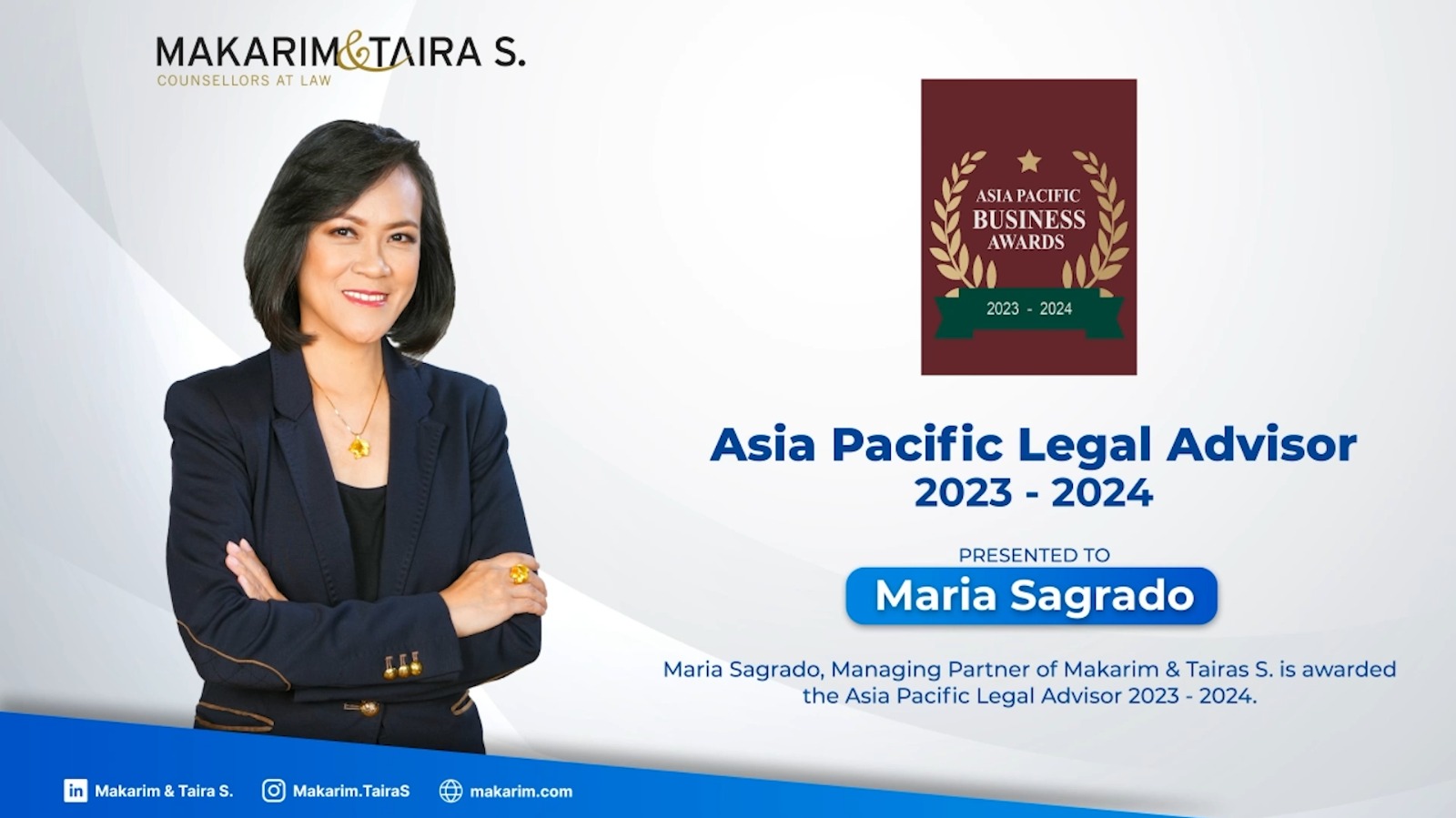 Maria Sagrado, the Managing Partner of Makarim & Taira S., has been given an Asia Pacific Legal Advisor award in recognition of her outstanding performance and dedication to business and industries in the Asia-Pacific region.