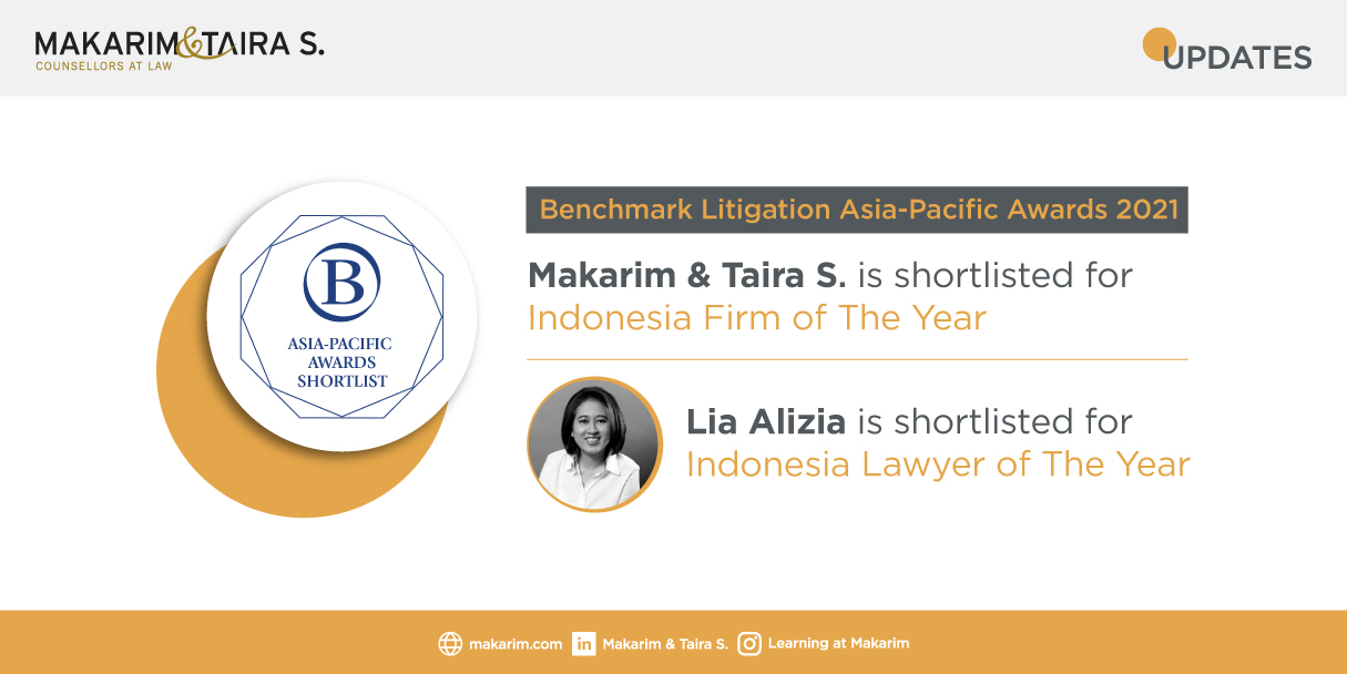 We proudly announce that Makarim & Taira S. is shortlisted in the Benchmark Litigation Asia-Pacific Awards 2021, in the Firm of the Year category. Additionally, our Managing partner, Lia Alizia, is nominated as Lawyer of the Year in the Indonesian jurisdiction.