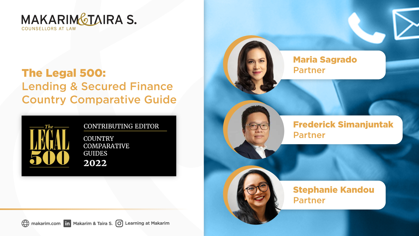 Our partners, Maria Sagrado, Frederick Simanjuntak and Stephanie Kandou recently authored The Legal 500: Lending & Secured Finance Country Comparative Guide for the Indonesian jurisdiction. The guide aims to provide its readers with a pragmatic overview of the lending and secured finance laws and regulations that apply across a variety of jurisdictions. The Indonesian chapter of this guide provides information about foreign lenders, interest, security registration requirements, guarantees and tax incentives.
