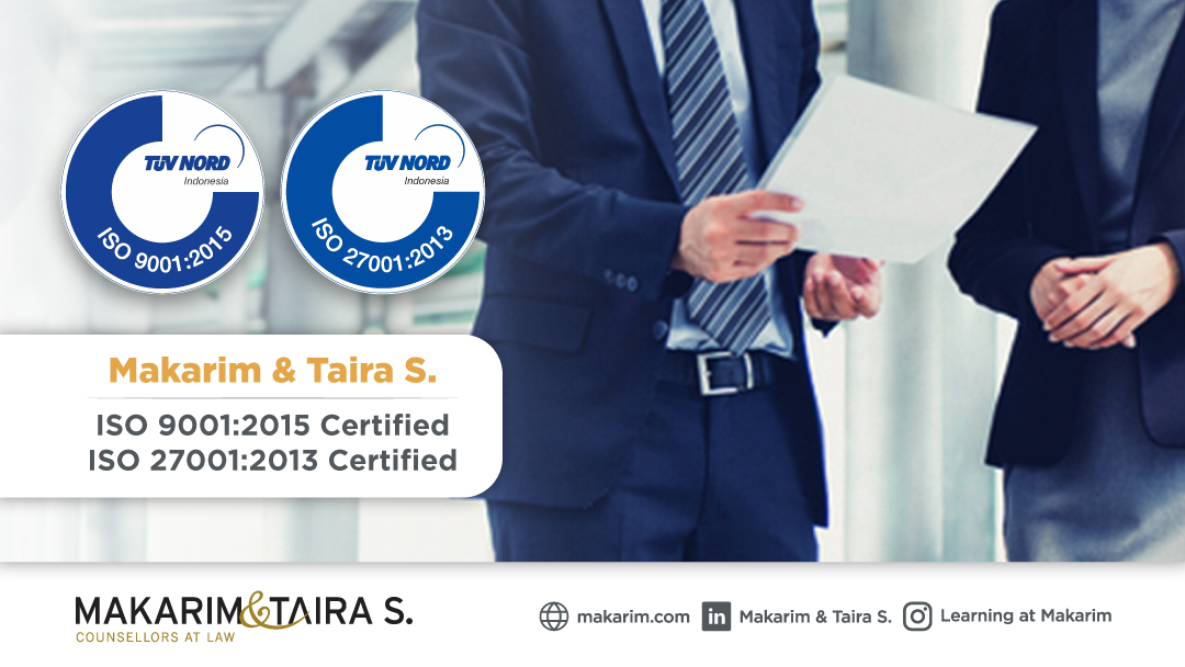 Therefore, it is with great pride that we announce that Makarim & Taira S. is ISO 9001:2015 and ISO 27001:2013 Certified.