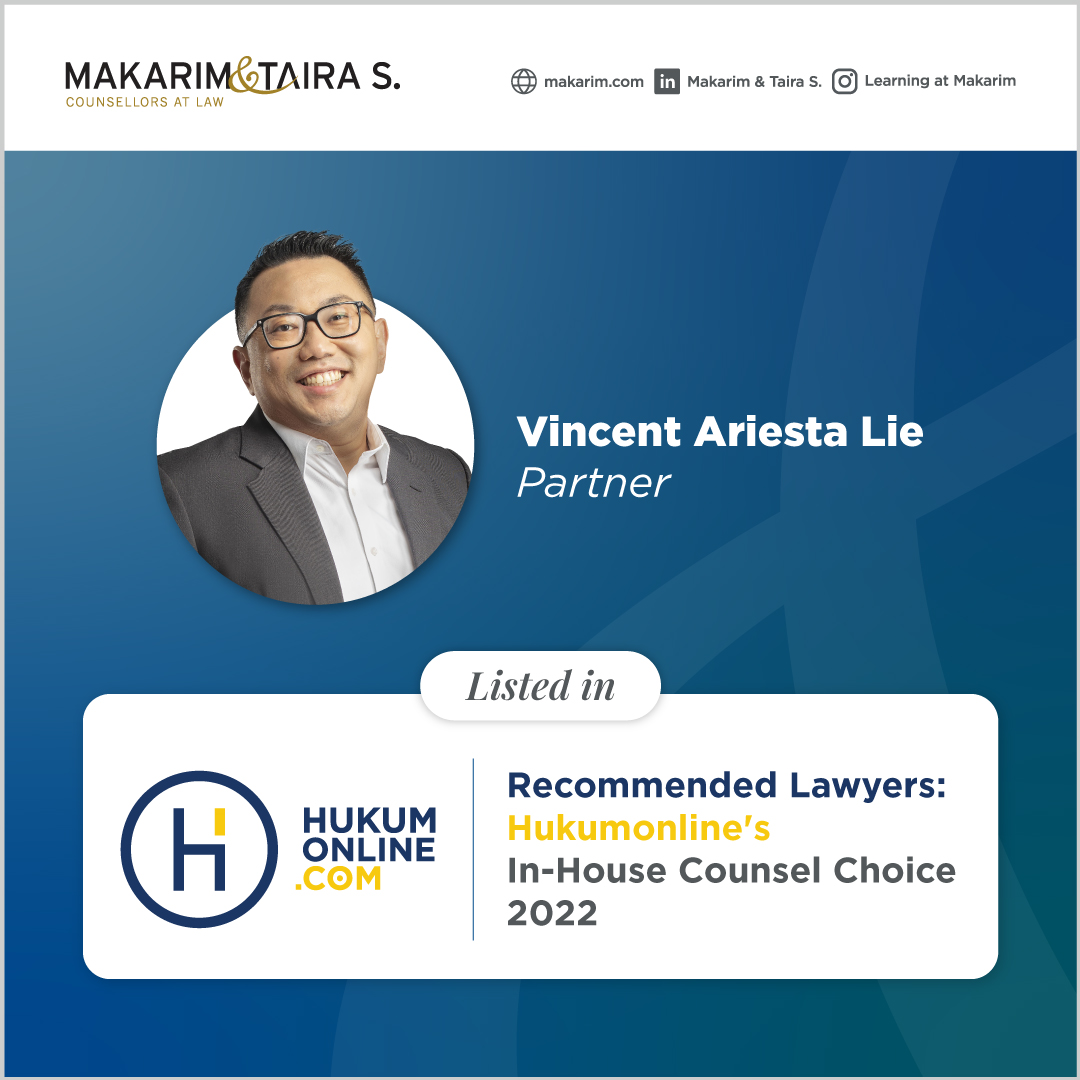 Vincent Ariesta Lie has once again been listed as one of the Recommended Lawyers in Hukumonline’s In-House Counsel Choice 2022