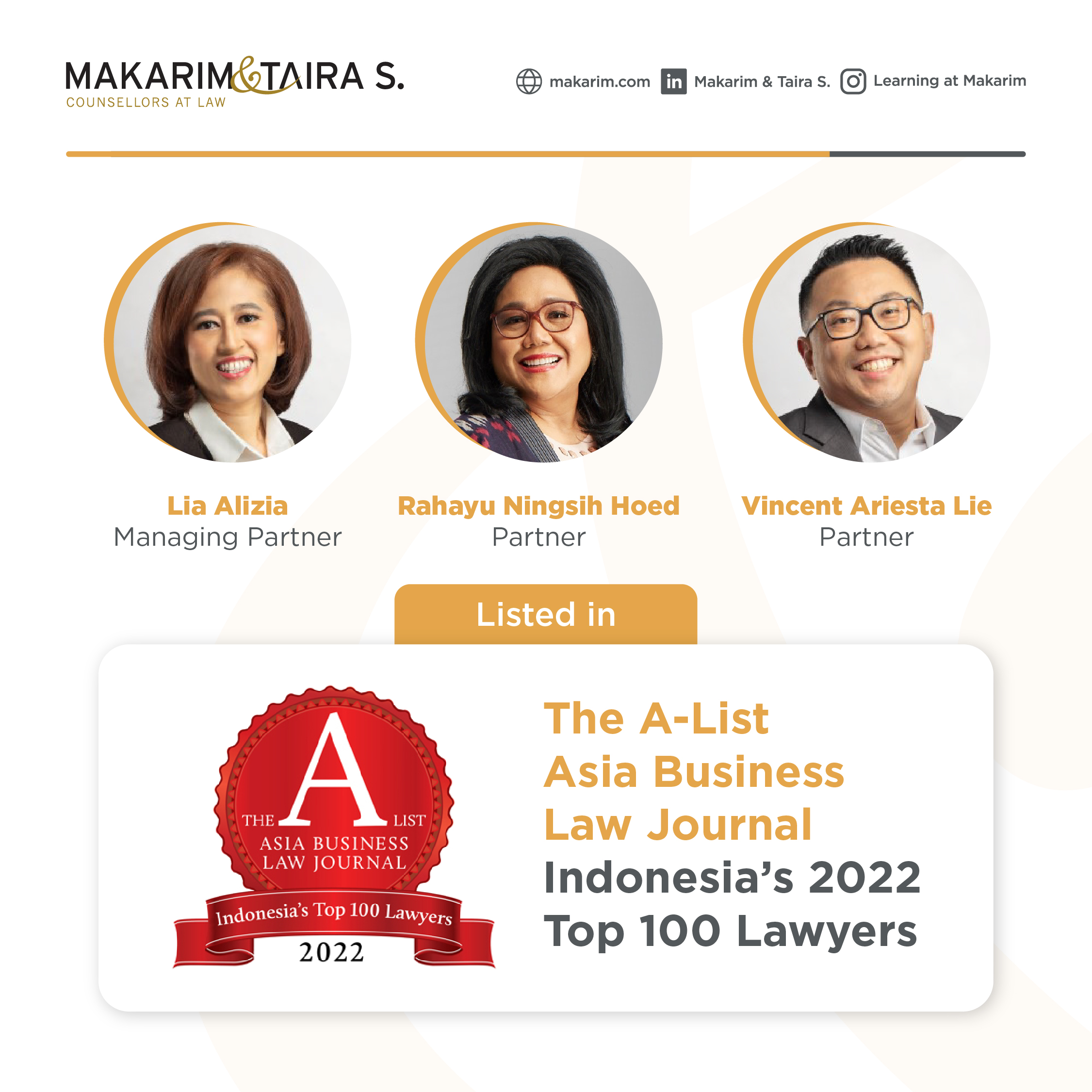 For the 5th consecutive year, our Managing Partner, Lia Alizia, our Senior Partner, Rahayu Ningsih Hoed and our Partner, Vincent Ariesta Lie, are listed among the Asia Business Law Journal Indonesia’s Top 100 Lawyers. Undoubtedly, this accomplishment is a reflection of their impressive and consistent commitment to providing high quality legal services to their clients. For Makarim & Taira S., this proves that one of the firm’s strengths is its position as a long-established firm with a multi-generational team of lawyers working together and bringing the best of their worlds to its efforts, providing clients with more than 40 years of collective experience and extensive knowledge that goes beyond legal matters.