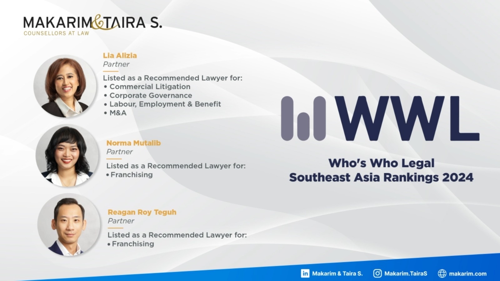 Our Partners have been acknowledged for their outstanding work in several key practice areas. Lia Alizia is recognized for her expertise in Commercial Litigation, Corporate Governance, Labour, Employment & Benefits, and M&A. Additionally, Norma Mutalib and Reagan Roy Teguh have been recognized as Recommended Lawyers in Franchising, further confirming their expertise in this specialized field.