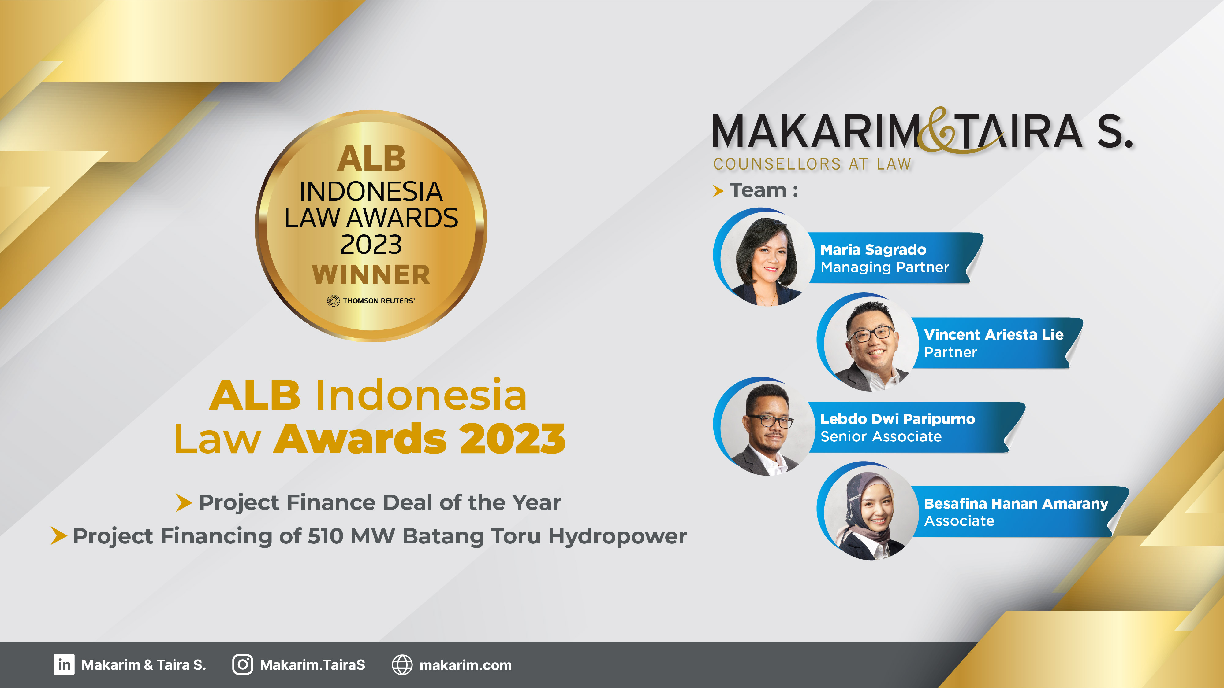 We are honored to share that Makarim & Taira S. has been recognized by Asian Legal Business (ALB) at the 10th Annual ALB Indonesia Law Awards 2023. Our firm received the award for Project Finance Deal of the Year for the financing of the 510 MW Batang Toru hydropower project in North Sumatra province.