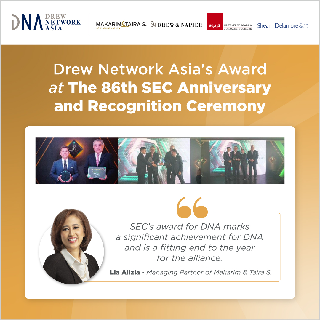 We are thrilled our network of premium law firms, Drew Network Asia (DNA), has been recognized with an award by the Securities Exchange Commission (SEC) of the Philippines for supporting the Commissionโs strategic initiative this year in pursuit of ease of doing business at its 86th Anniversary and Recognition Ceremony on Tuesday, 29 November 2022.