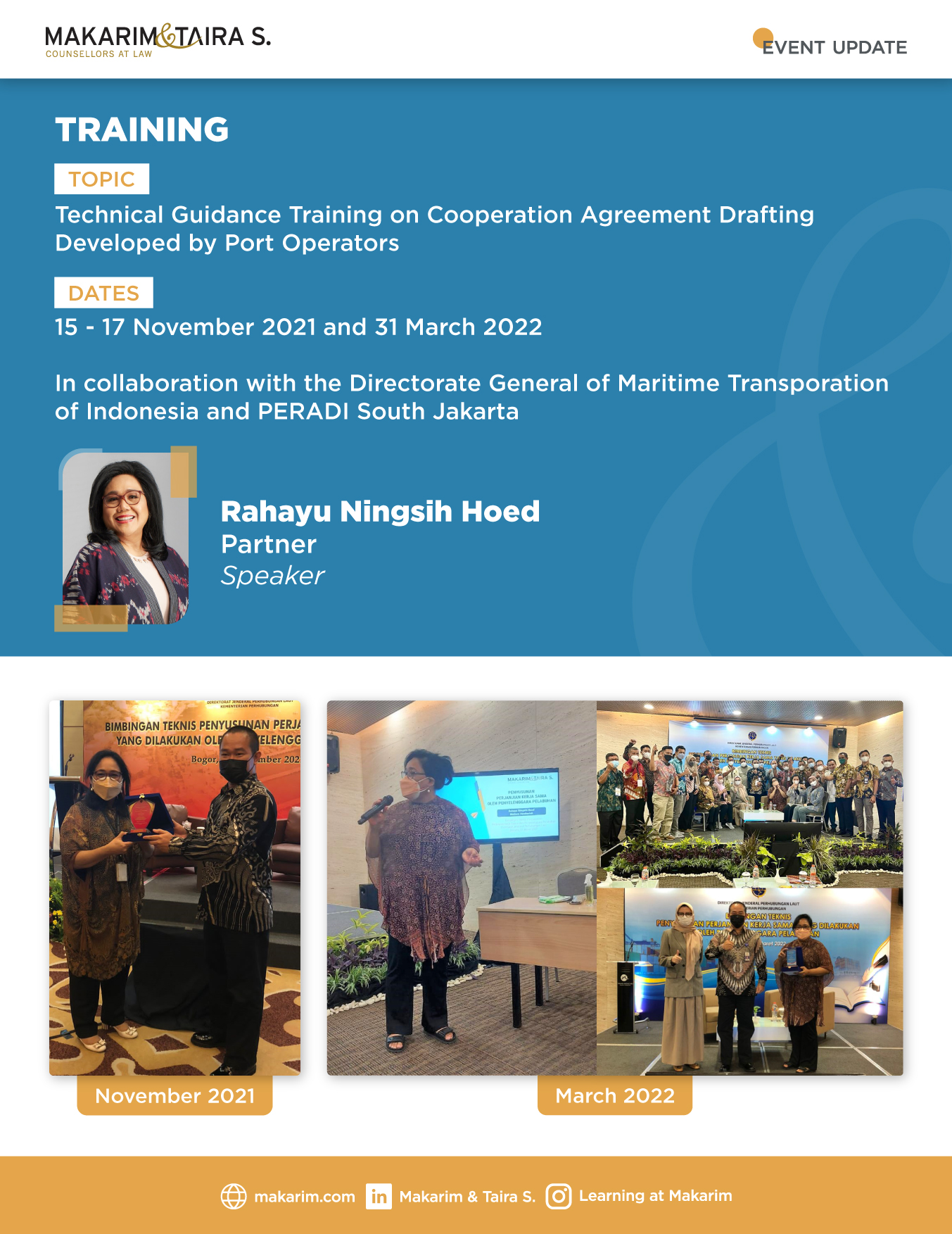 For two consecutive years, Rahayu or ‘Yayuk’, has been invited to represent the Indonesian Advocate Association (PERADI) South Jakarta to speak in Technical Guidance Training on Cooperation Agreement Drafting developed by Port Operators. The trainings were initiated by the Directorate General of Maritime Transportation of Indonesia and attended by 60 representatives of port operator offices from all over Indonesia, comprising main port offices, navigation district offices, harbor port offices and port authorities as well as port management unit offices.