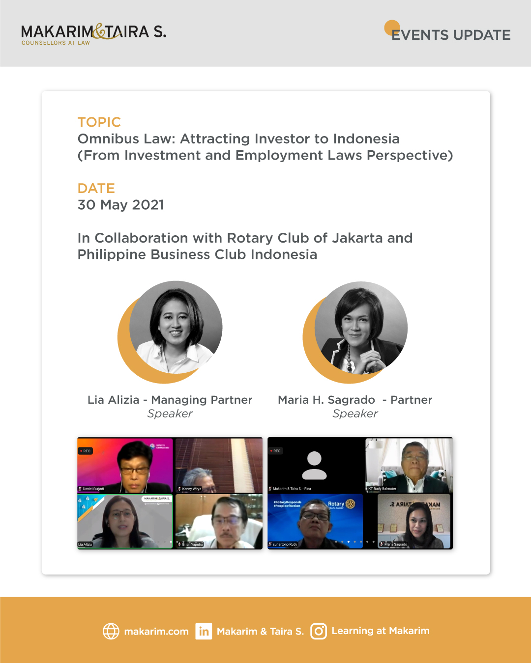 Lia Alizia and Maria Sagrado spoke in a webinar held on May 30th, 2021, in collaboration with Rotary Club of Jakarta and Philippine Business Club Indonesia, on the topic of Omnibus Law. This webinar covered strategies on how to attract investors to Indonesia from investment and employment laws perspectives.